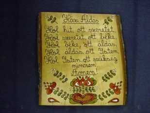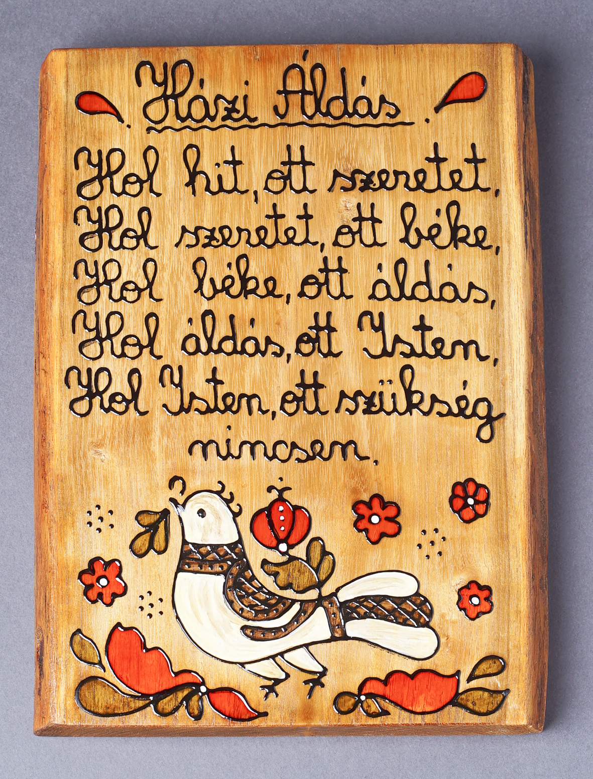 Fára festett, népies motívumokkal díszített fali kép: Házi áldás