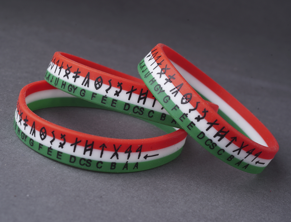 Piros-fehér-zöld szilikon karkötő rovás ABC-vel.