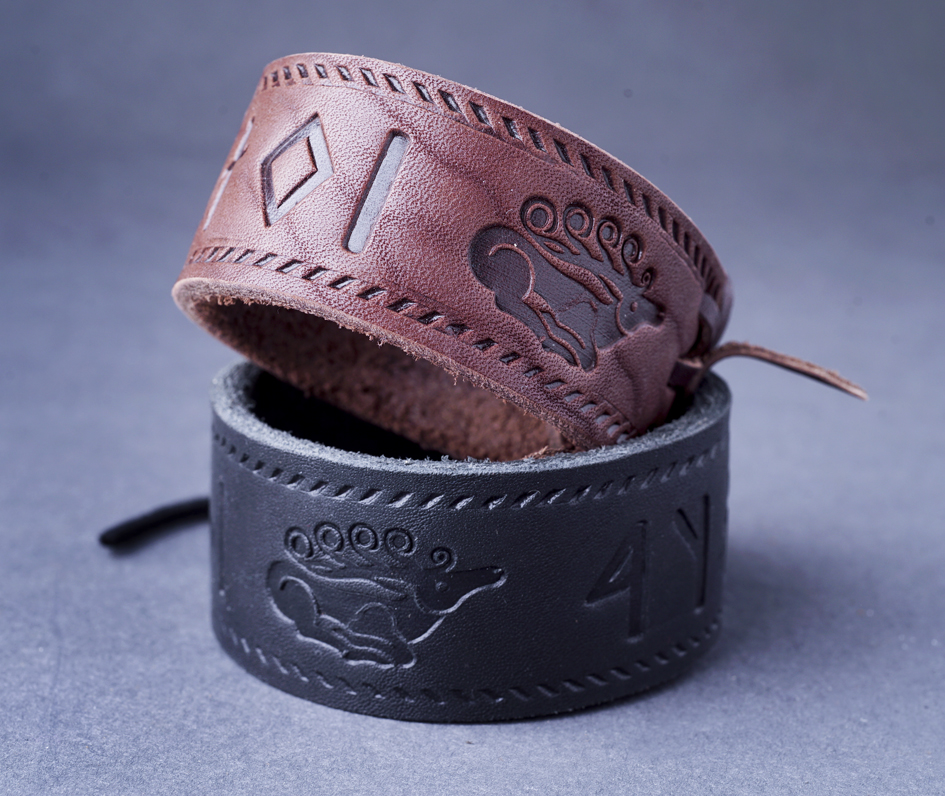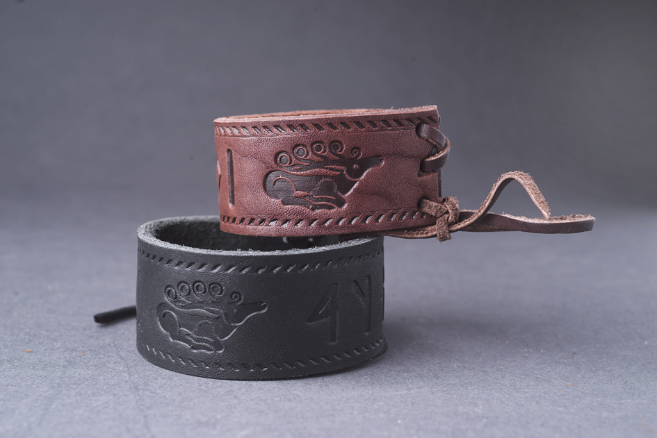 Széles bőr karkötő szkíta szarvas mintával. Bőrszállal köthető.
