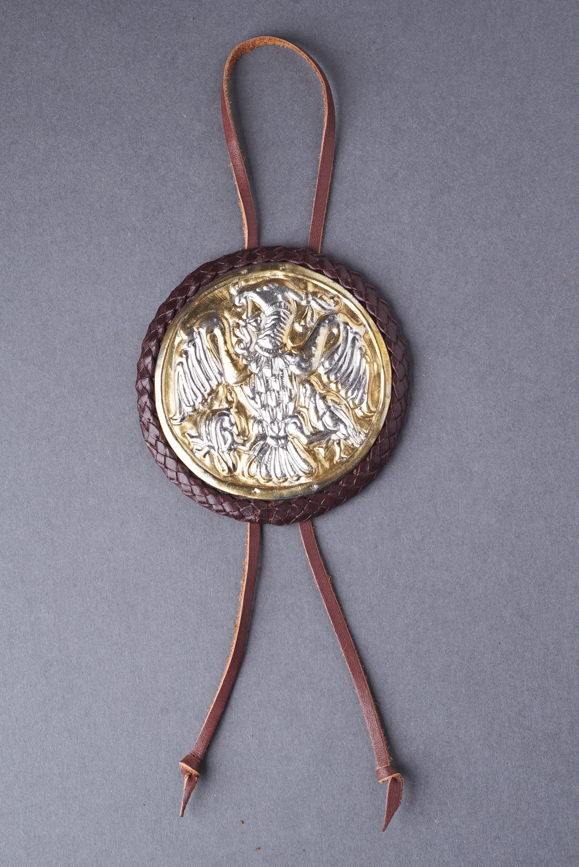 A korongot a bőrszíj segítségével kell a hajfonatba rögzíteni.