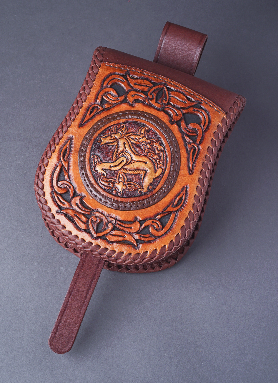 Bőr tarsoly, mítikus növény-állat ábrázolás (IX-X. század, Karos-eperjesszögi lelet) bőr lemezen.