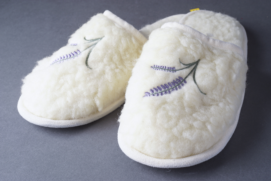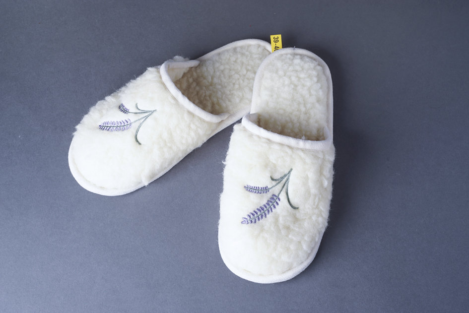 Birkagyapjúból készült meleg téli papucs hímzéssel.