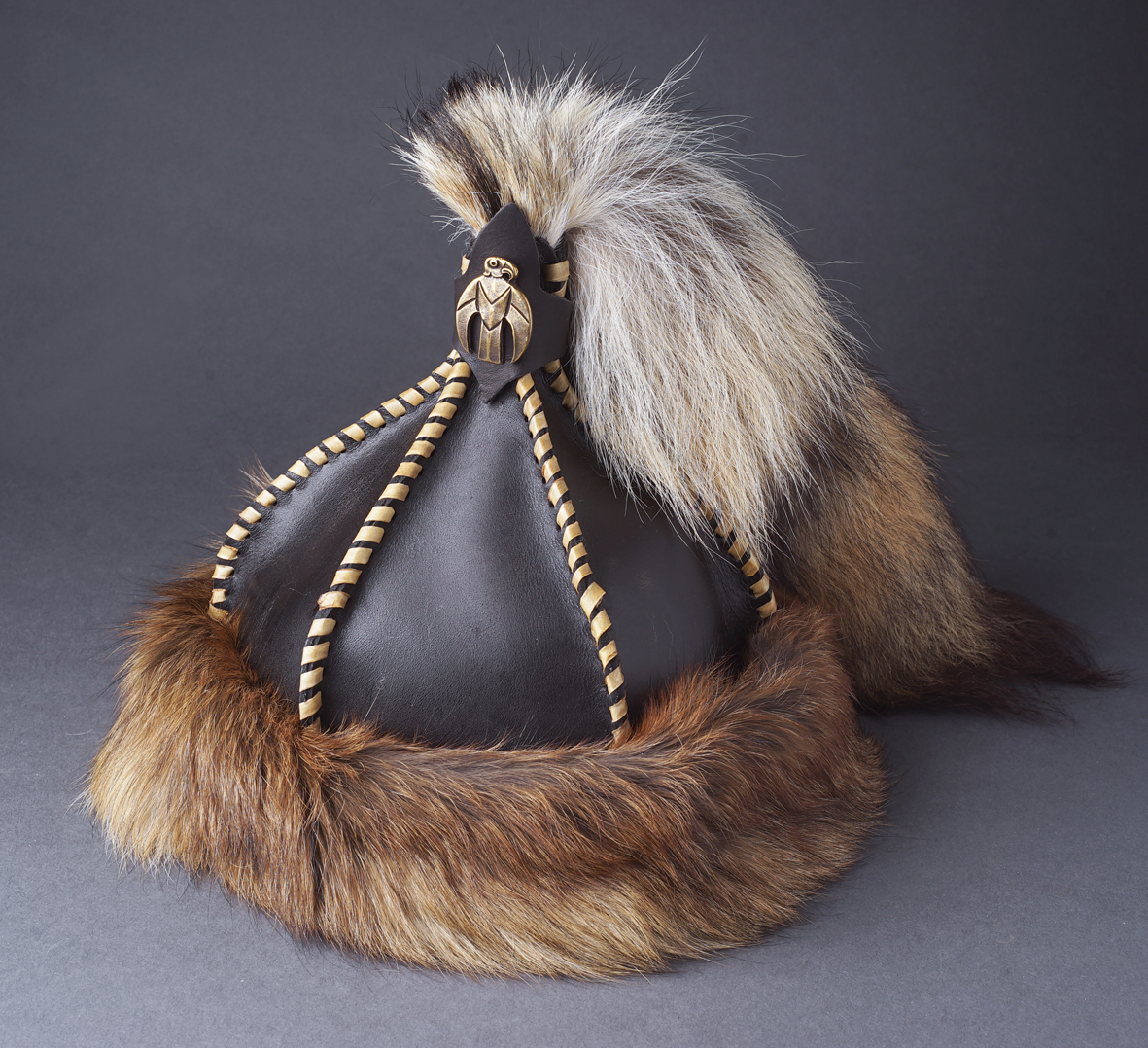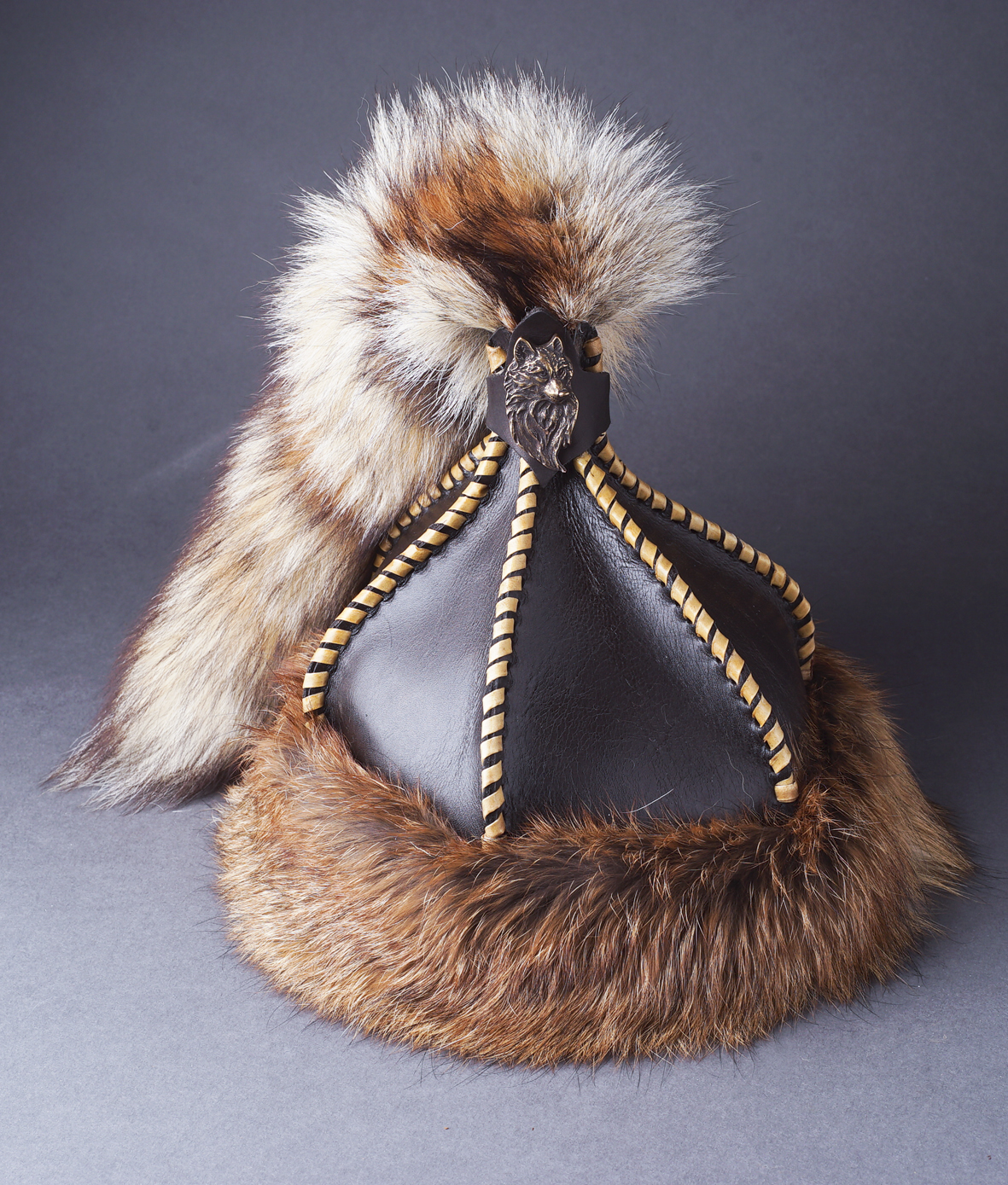 Bőr süveg rókaprémmel és farokkal.