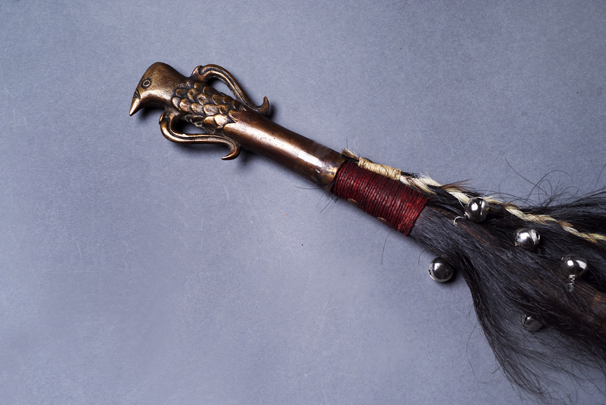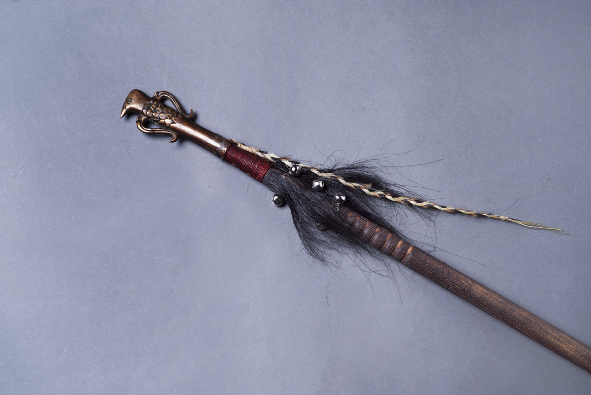 Bronz fej madár motívummal, csörgővel és lófarokkal díszítve.