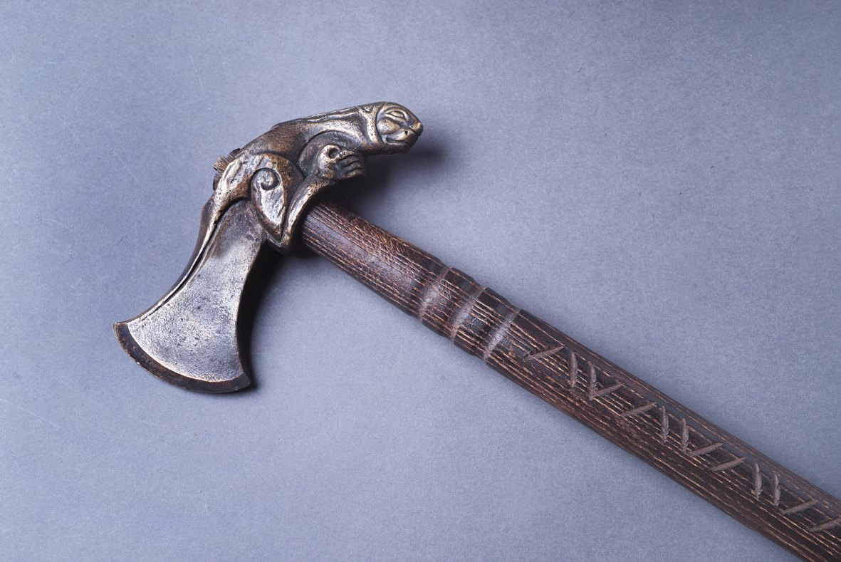 Szkíta eredetű párducot formázó balta. A lelet másolata öntött réz, antikolt fa nyéllel. Teljes hossza: 75-80 cm