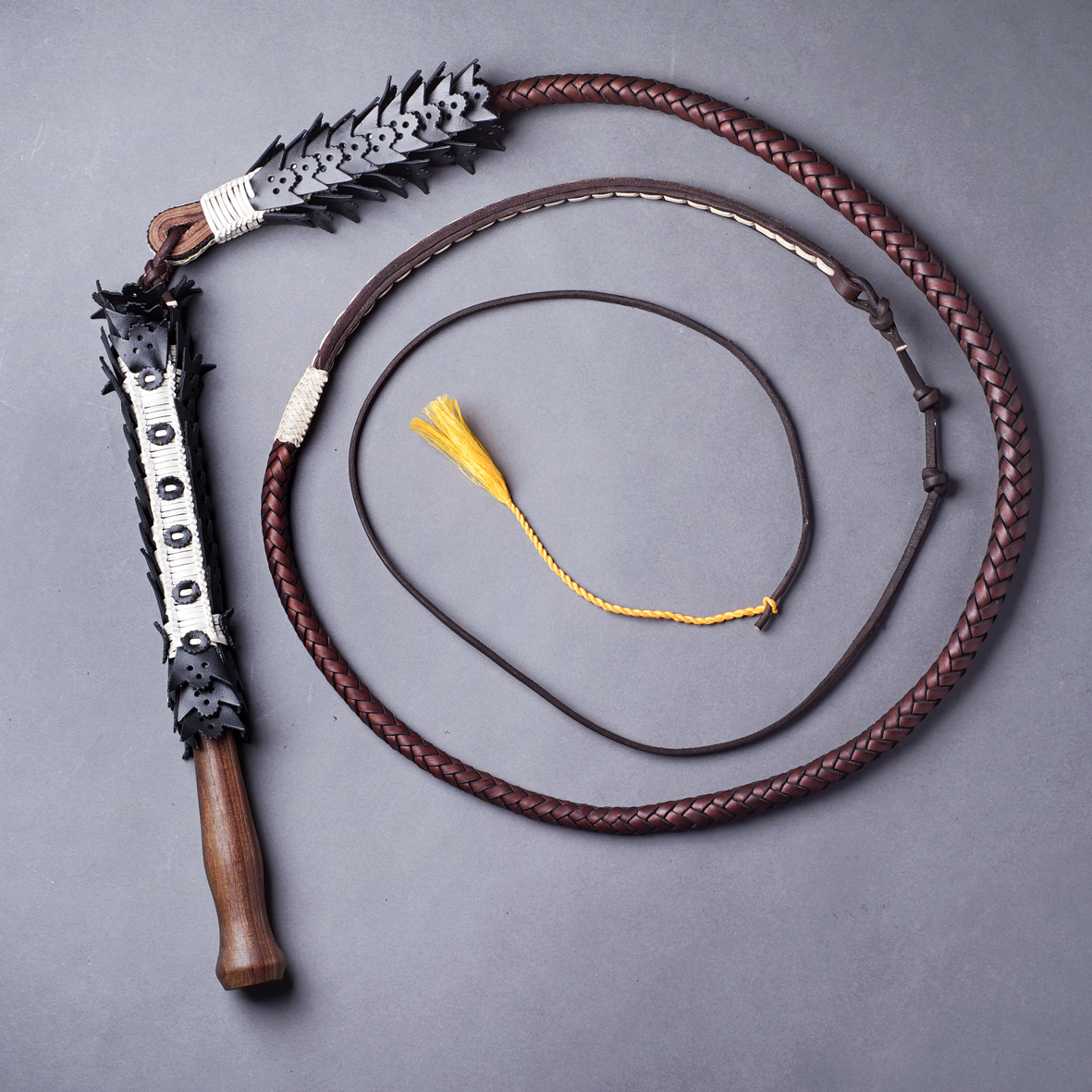 Az ostor bőrből, úgy nevezett „timsós” bőrből fonva, 8 ágú fonással, sallangos bőr díszítéssel.