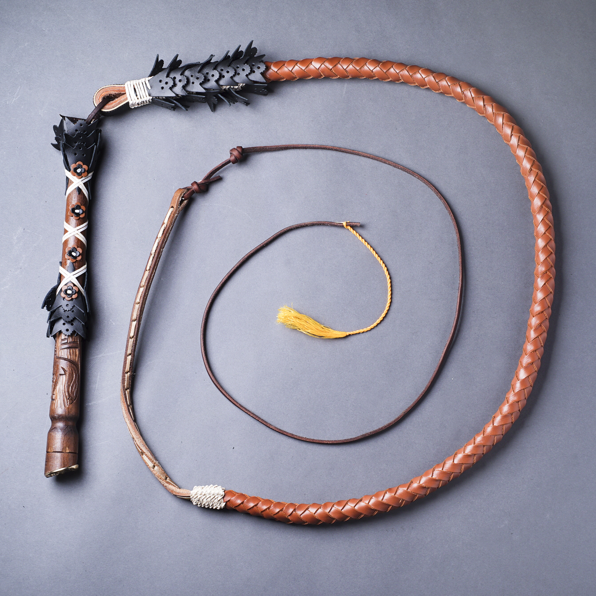 Az ostor 220 cm hosszú, faragott nyéllel, sallangos bőr díszítéssel.