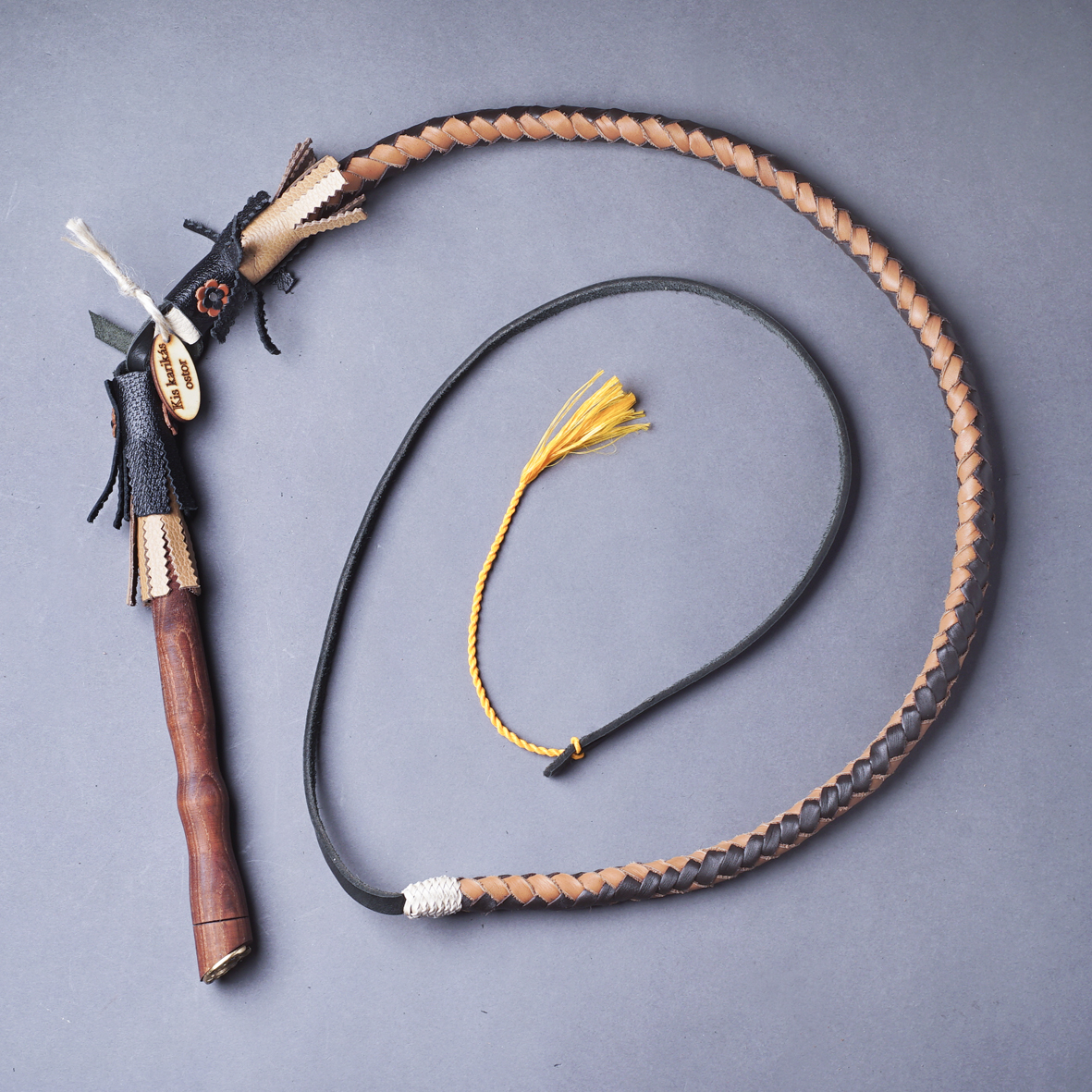 Az ostor 220cm hosszú, kétszínű bőrből fonott, díszes, sallangos nyéllel.