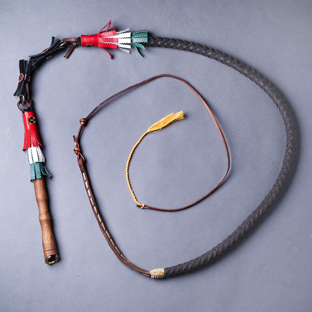 Az ostor bőrből fonott 8 ágú fonással, nemzeti színű sallangokkal.