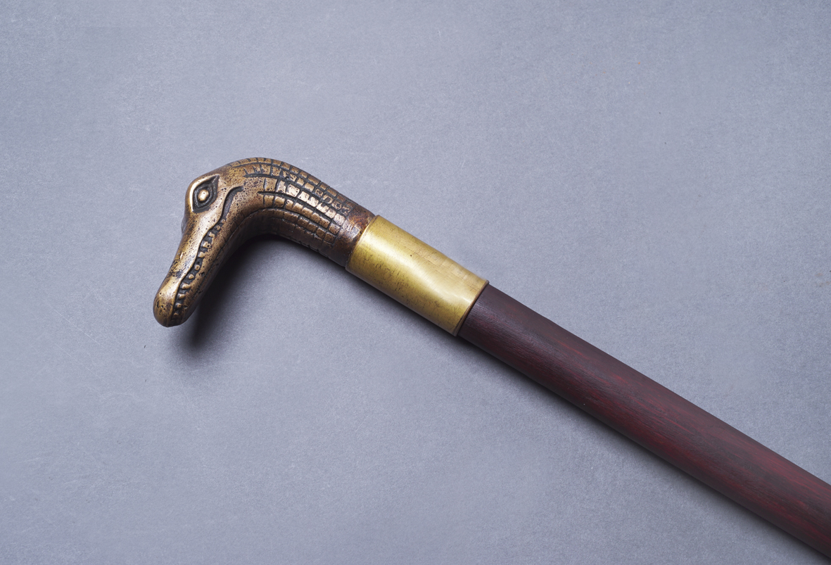 A bot feje öntött rézből készült, krokodil fejet formáz. A nyél festett kőrisfa.